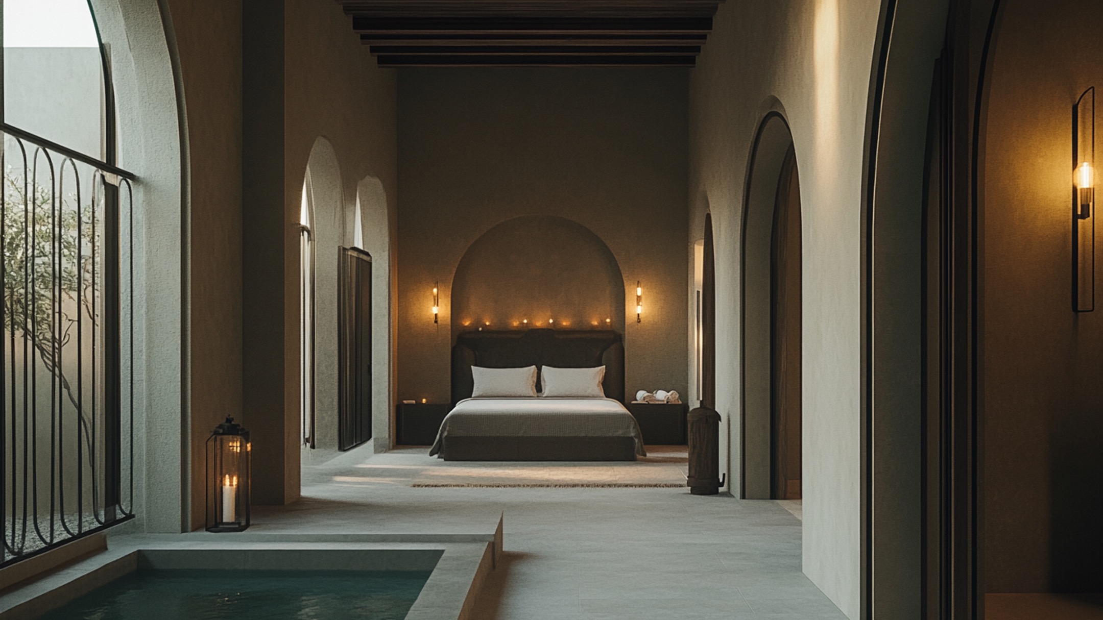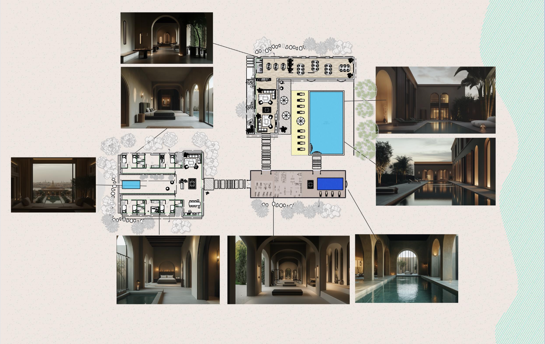Au Royal Jawhara, tout est conçu pour rappeler cette réalité : nous ne sommes que de passage, sur cette terre comme entre ces murs. Dans un monde où chaque empreinte compte, je souhaite que chaque visiteur laisse derrière lui un souvenir léger, une trace empreinte de respect et de gratitude. L’architecture elle-même se révèle à travers des espaces de transition, des cours ouvertes, des arcades lumineuses qui invitent à l’errance rêveuse. Chaque détour invite à circuler, à se laisser porter sans heurts, à se rappeler que tout ici est un mouvement.